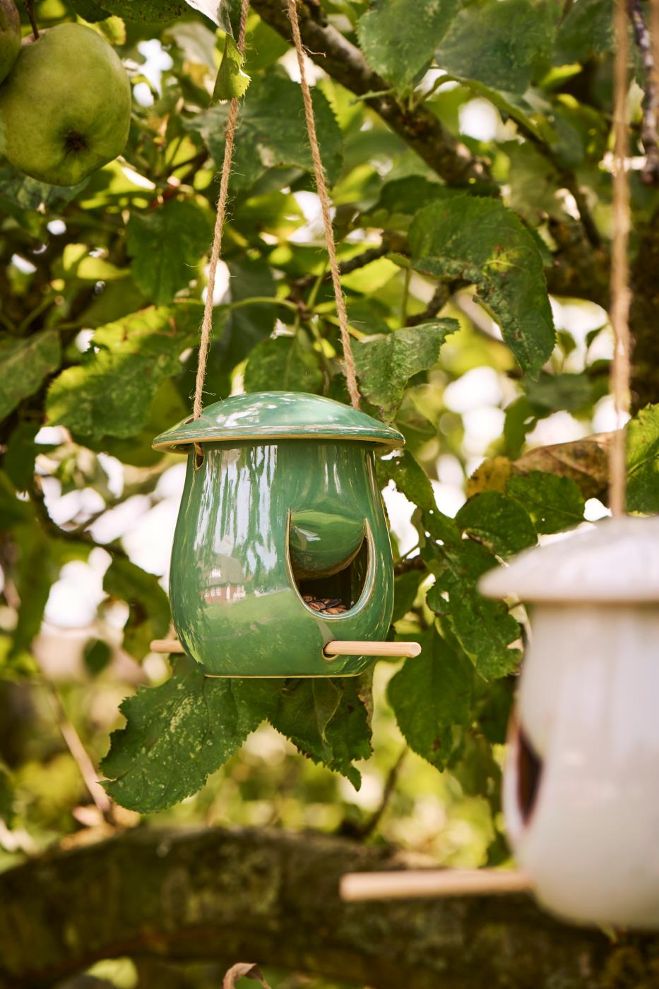 Vogelvoederhuisje petrol in keramiek van het Deense IB Laursen om op te hangen. Formaat 12,5×11 cm.